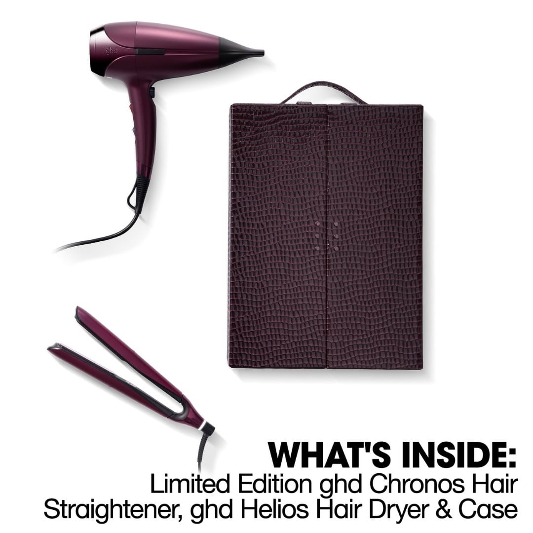 Check-in to a world of luxury this festive season with the ghd cherry chic collection. This limited-edition set invites you to embrace timeless, seductive styling with tools that elevate your beauty ritual. Featuring the ghd Chronos™ professional HD motion-responsive™ styler and the ghd Helios™ professional hair dryer, both draped in an opulent cherry red and presented in a luxurious croc-inspired vanity case.