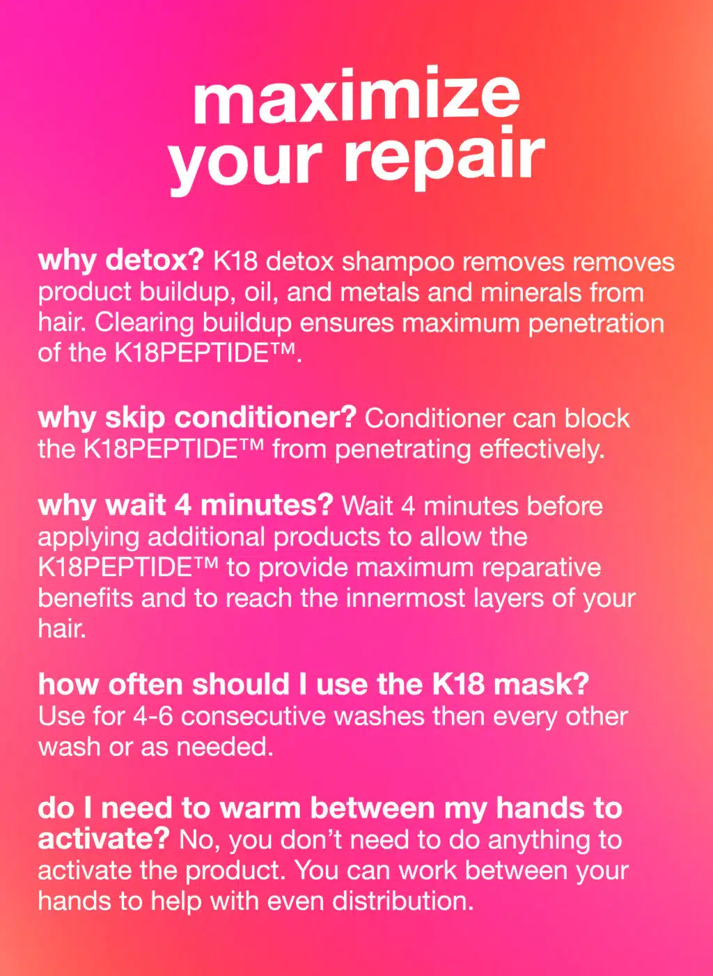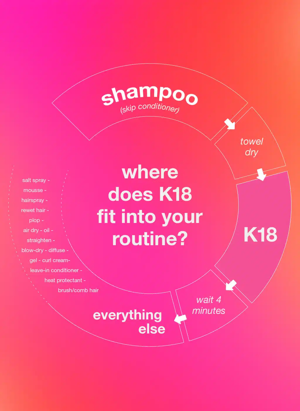 - Begin with 1 pump of the K18 Mask and add more as needed depending on the length, thickness, and condition.