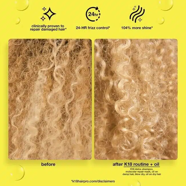 Pro Tip – Got the K18 molecular repair mask? Use the mask first on clean, damp hair, then wait 4 minutes. Apply the molecular repair hair oil, and wait 4 minutes for maximum strengthening results.