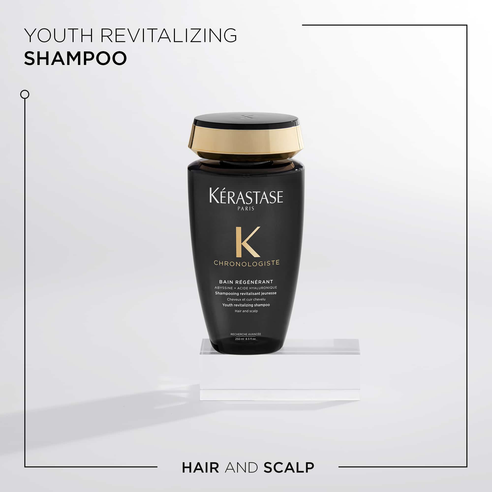 Chronologiste Bain 250ml is a youth revitalizing shampoo to gently remove impurities from scalp and fiber in dull hair. Infused with Hyaluronic acid, Abyssine and Vitamin E to fight the signs of aging scalp and hair. Provides long-lasting hydration to the scalp, with added moisture, shine & strength to the fiber for youthful bounce and voluptuosity. Infused with the signature Chronologiste scent of fine fragrances, including tea rose, light woods and musk. Bain Régénérant is a luxurious sensorial experience.