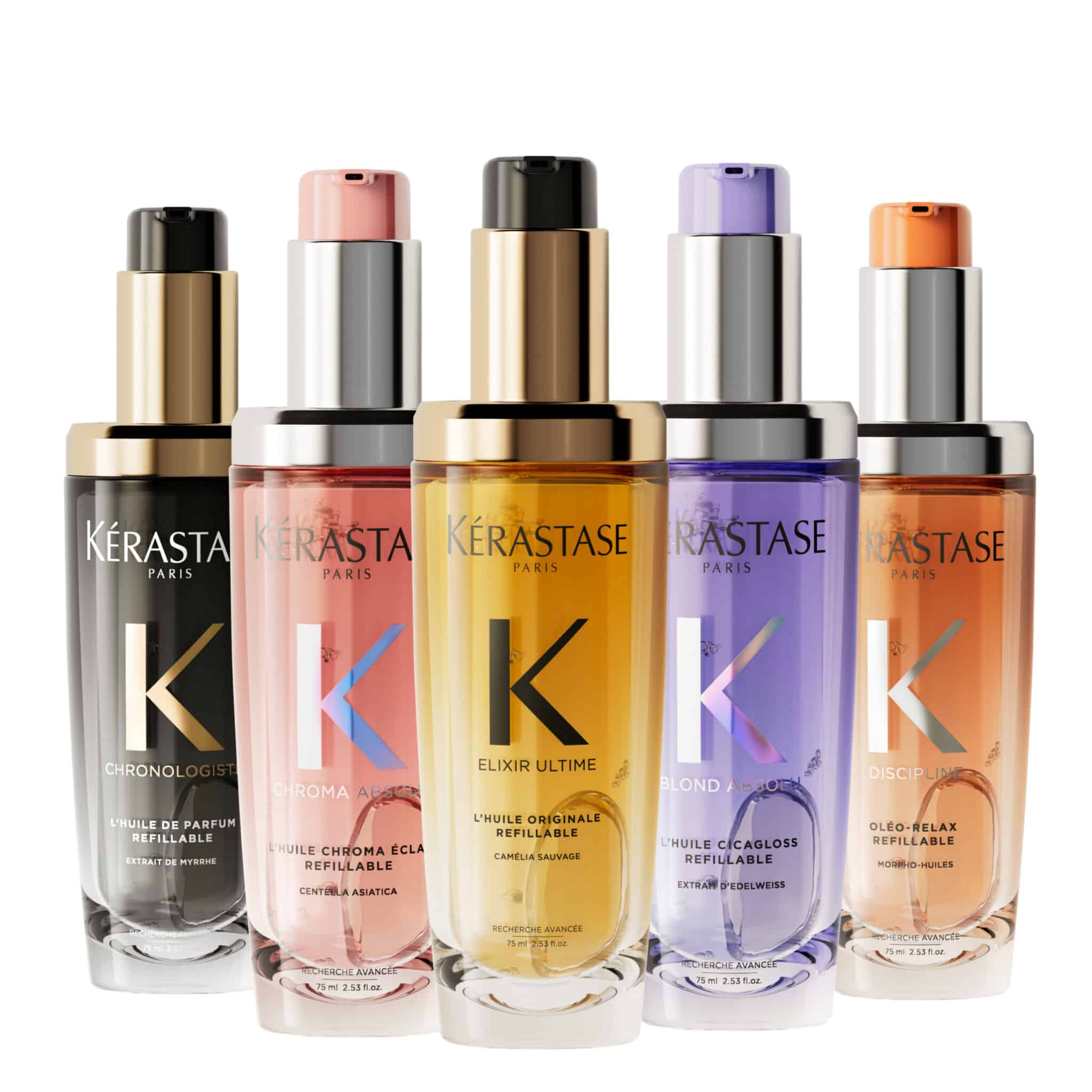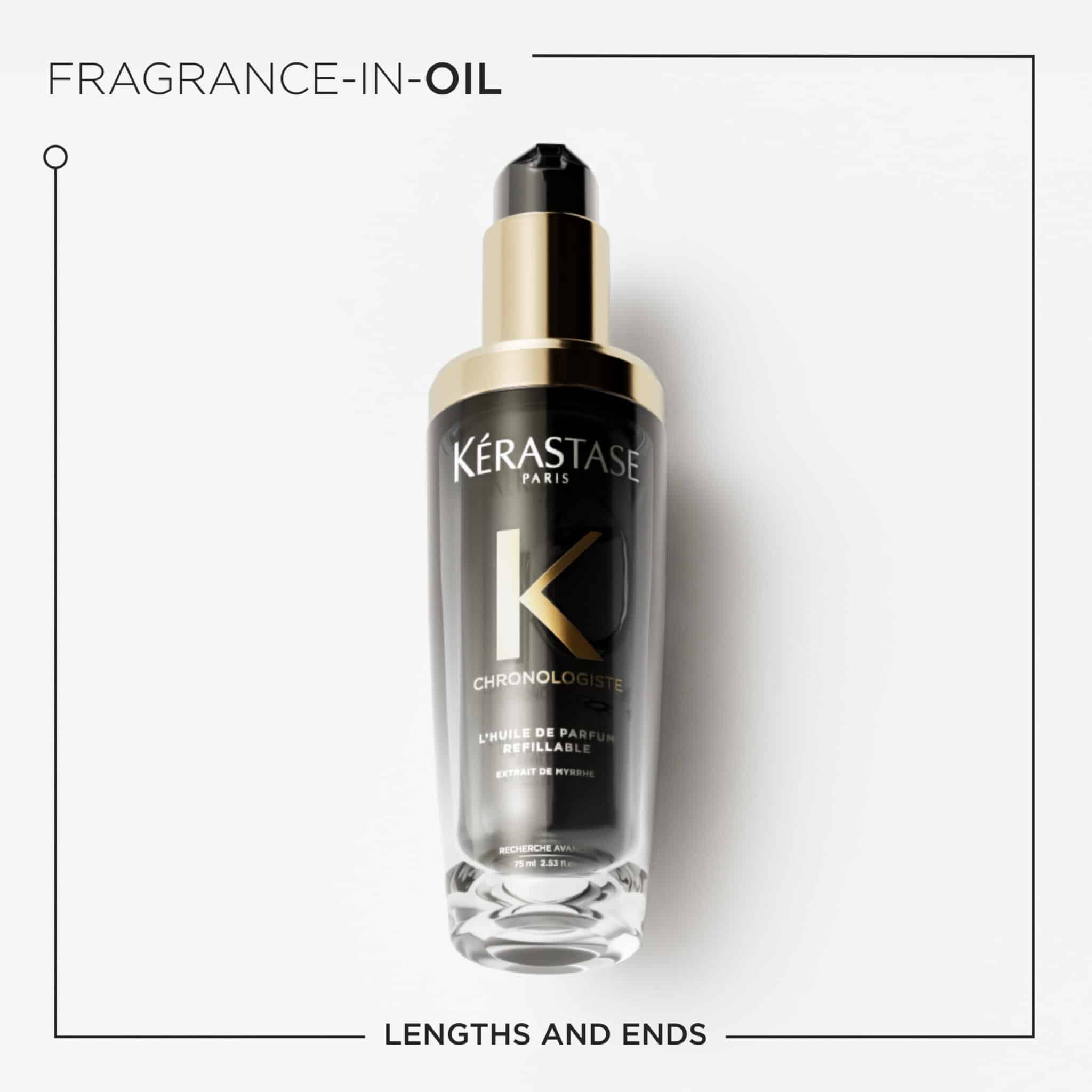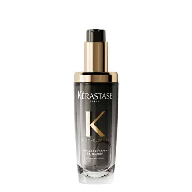 Infused with Myrrh extract, Kérastase Chronologiste L’Huile de Parfum is a fragrance-in-hair-oil made of an exceptional combination of noble notes from the world of fine fragrance: Tea Rose, Light Woods and Musk. Delicately fragranced, hair is revitalised, moistured and thickened after a few drops.