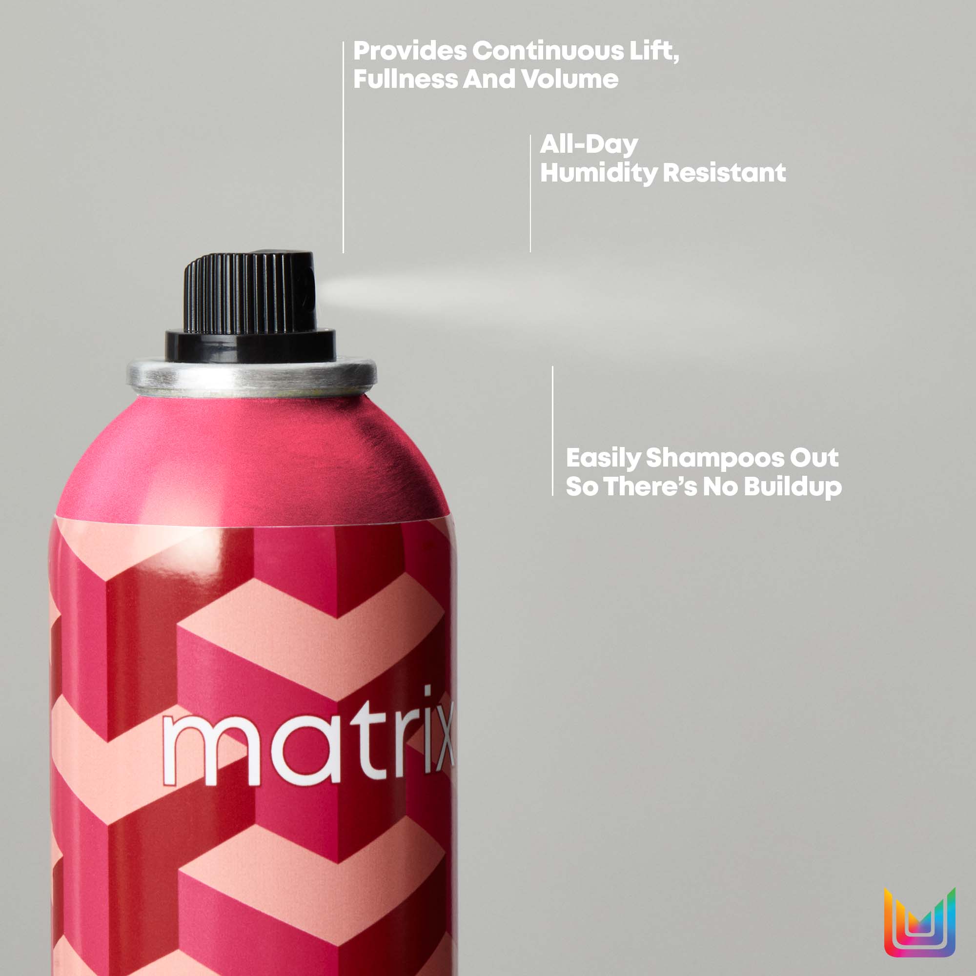 Matrix Styling Fixer Hairspray offers a flexible hold with a dry finish. Its fast-drying vegan formula locks in style for 8 hours while resisting humidity. The spray provides continuous lift, fullness, and volume to any style, making strands shinier without the helmet effect, tacky feeling, or flaking.
