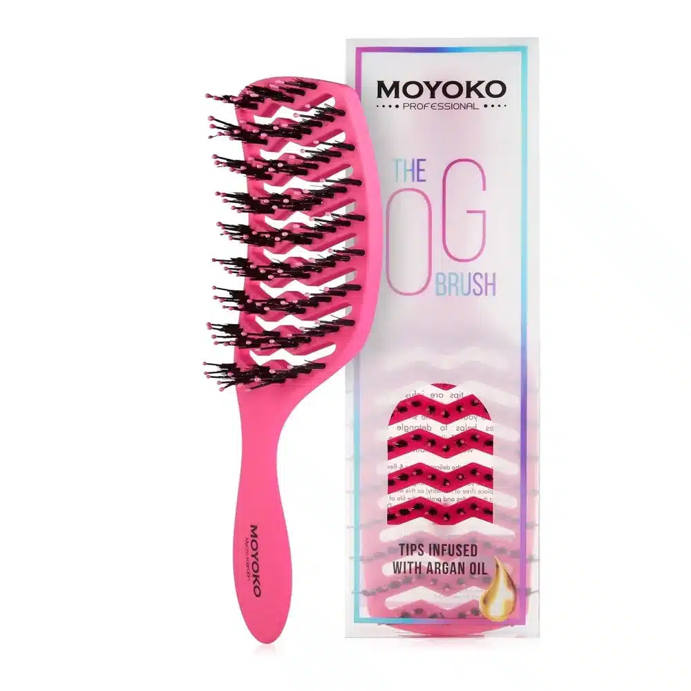 Moyoko Detangling Brush – Pink, the sophisticated tool specifically crafted to transform your hair care routine. Unlike conventional brushes that often cause breakage and discomfort, this innovative detangling brush utilizes a unique rounded design and Argan oil-infused pins to effortlessly glide through knots while nourishing your hair.