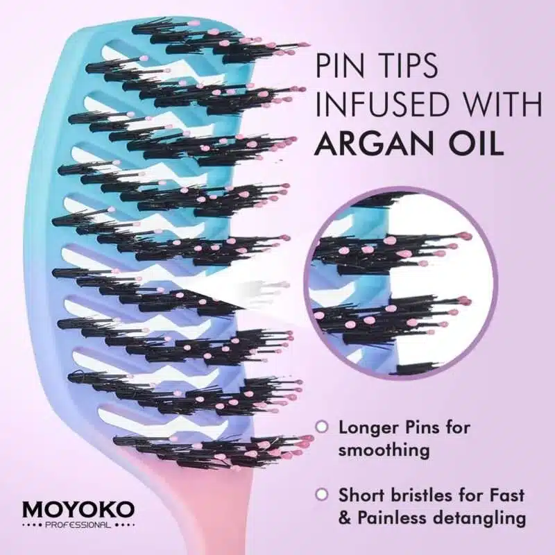 The Moyoko brush has a rounded shape to comfortably fit the shape of your head, making it easier and more efficient to brush your hair. The hair bristles and pins are made from nylon. The brush pins contains Argan oil to add softness and shine to your hair. The small silicone pins help detangle the hair and reduces frizz.