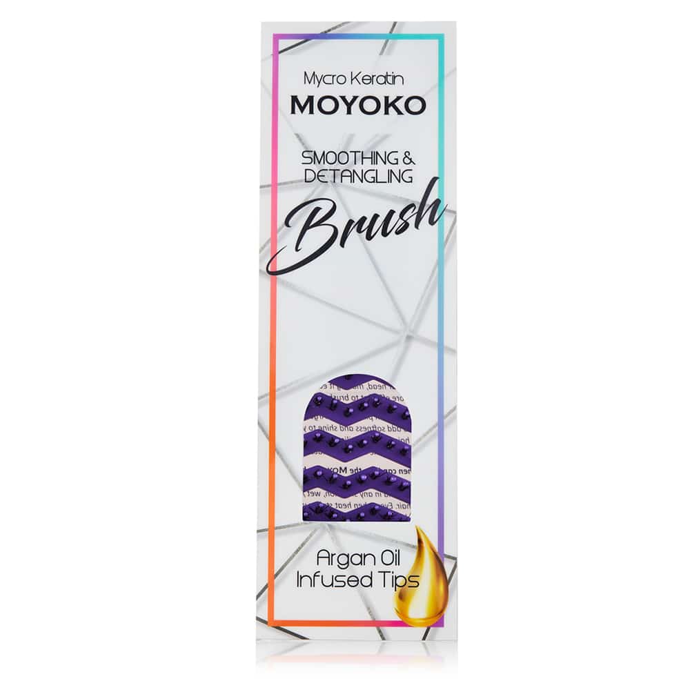 The Moyoko brush has a rounded shape to comfortably fit the shape of your head, making it easier and more efficient to brush your hair. The hair bristles and pins are made from nylon. The brush pins contains Argan oil to add softness and shine to your hair. The small silicone pins help detangle the hair and reduces frizz.